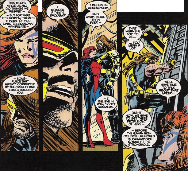 Jean: “This war’s made us all do things we regret -- But for what it’s worth, there’s a part of you Sinister couldn’t manipulate -- Someplace that wasn’t corrupted by the cruelty and hatred around you.”