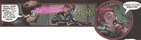 That night, Rogue hears Logan’s screams and tries to wake him from his nightmare. She gets stabbed instead, but uses her ability to absorb other mutant’s powers, in this case Logan’s healing factor, to heal herself. Scott, Jean and Ororo (field name Storm) come running in and witness Rogue’s powers in action. She leaves after healing herself. Jean immediately goes to check on Logan’s weakened condition, angering Scott even more to see Jean showing what he deems affection towards Logan.