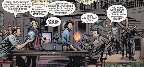 At the Xavier’s School for the Gifted, Bobby and John compare their powers, whether it would be worse to die frozen or burnt. Meanwhile, the staff, Professor Xavier, Scott, Jean and Ororo are concerned about the recent “mutant attack” on the President and the possibility of the re-introduction of the Mutant Registration Act. Scott thinks that Magneto is behind the attack. Xavier has his doubts, but intends to question Lensherr personally to find out.
