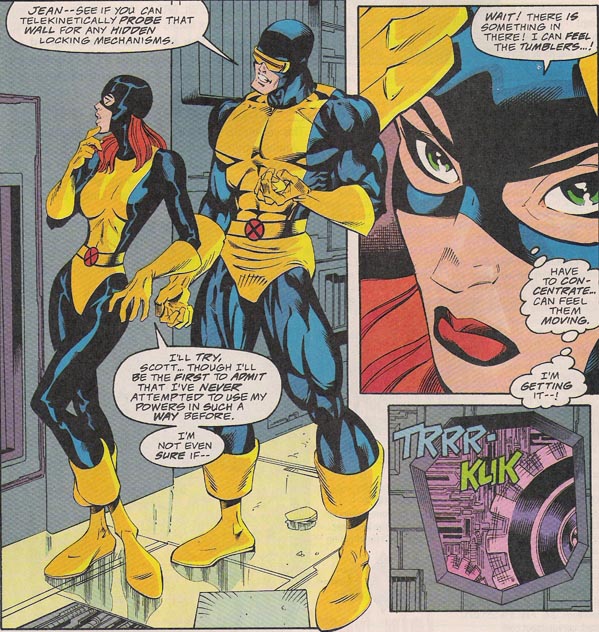 The fortress goes up in flames and is beginning to collapse. The X-Men quickly come up with an escape plan. Beast leaves with Iceman while Angel flies Cyclops and Marvel Girl to safety. Marvel Girl uses her telekinetic powers to open the sealed exit.