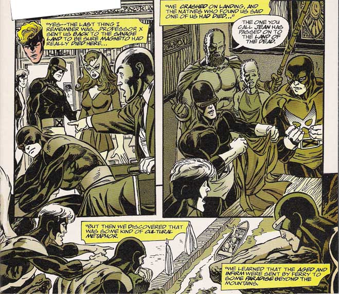 As Cyclops and Beast wander around the complex, to their horror, the people taken to this “paradise promised by legend” are being used as slaves. Beast suspects that someone is taking advantage of the place’s “miraculous healing”. Cyclops wonders why their friend and the “self-proclaimed lord” of the Savage Land, Ka-zar never mentioned this place.