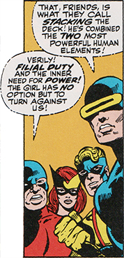 Magneto tries to sway Lorna into fighting by his side by virtue of the fact that she is his daughter. But the X-Men stand in his way. Iceman lunges at Magneto in a fit of anger, and has to be restrained by Cyclops and Beast. It is Cyclops who throws the first punch at Magneto instead.